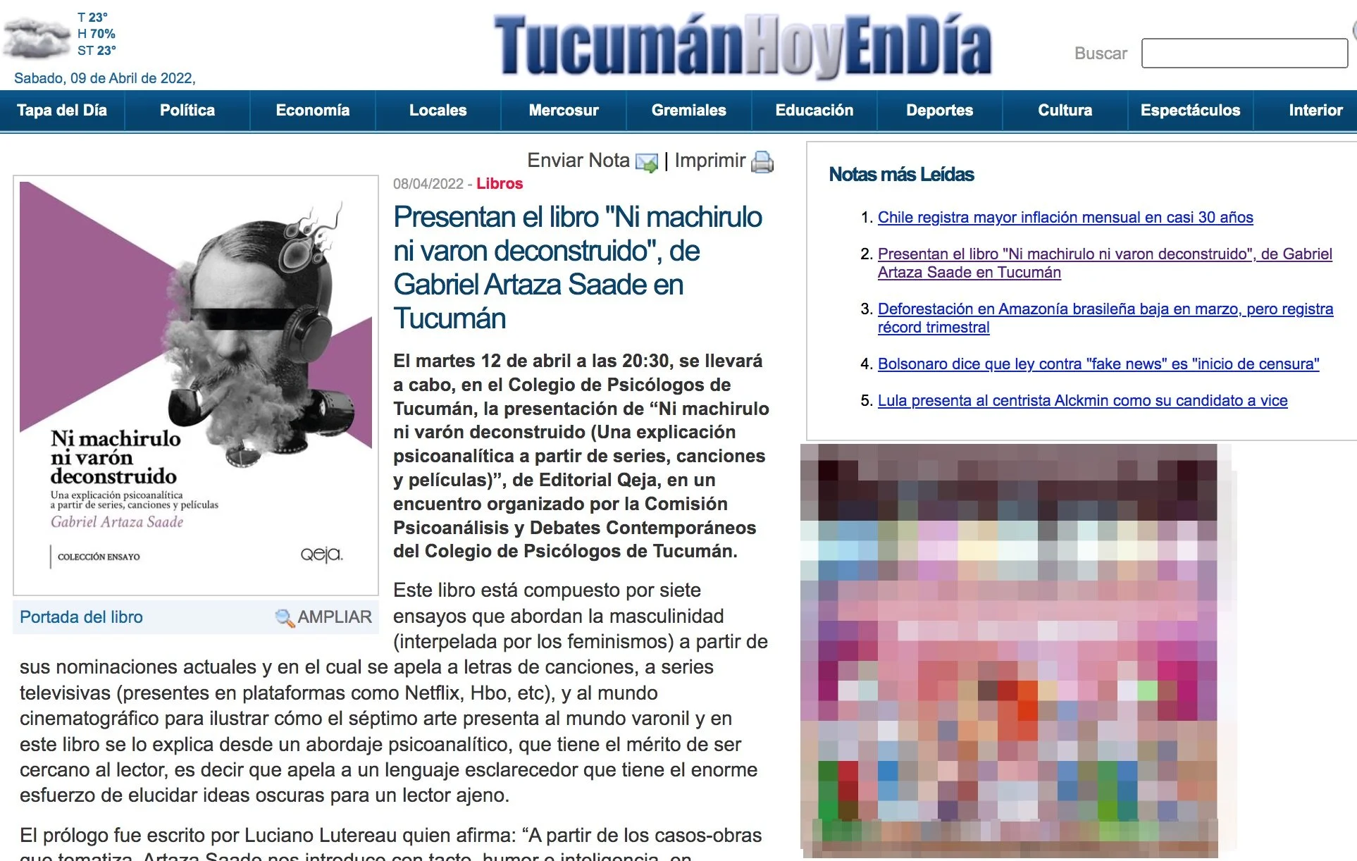 Gabriel Artaza Saade (Tucumán, 1979) es psicólogo en el Poder Judicial de Tucumán (Gabinete Multifueros). En el año 2018 publicó “Una nueva virilidad y otros ensayos sobre el sexo y la época” (Letra Viva); en el 2020 escribió en la publicación “El deseo en cuarentena” (Imago Agenda); en el 2021 participó en un capítulo junto a Luciano Lutereau en “El fin de la masculinidad” (Paidós); el mismo año publicó junto a colegas “Estúpido y sensual amor” (La docta ignorancia). Colabora con artículos de actualidad en el diario La Gaceta. Coordina la comisión "Psicoanálisis y debates contemporáneos" del Colegio de Psicólogos de Tucumán.